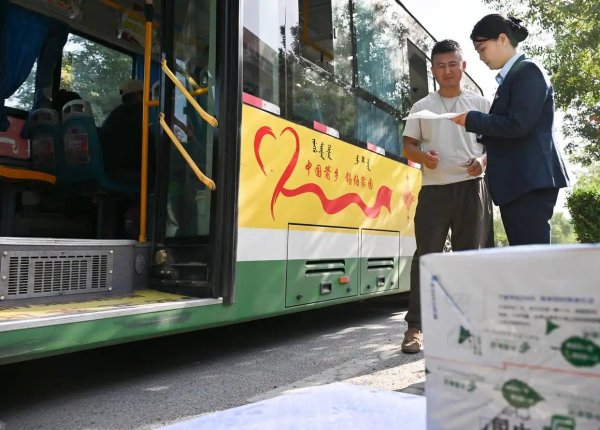 新疆伊犁州米粮泉乡米粮泉村邮政所工作人员(右)在同公交车司机交接邮件。近年来,伊犁州邮政分公司通过和公交公司合作,利用公交车的冗余载能将邮件投送到村级邮政所,为当地各族群众带来便利(9月8日摄)。新华社记者 李贺 摄