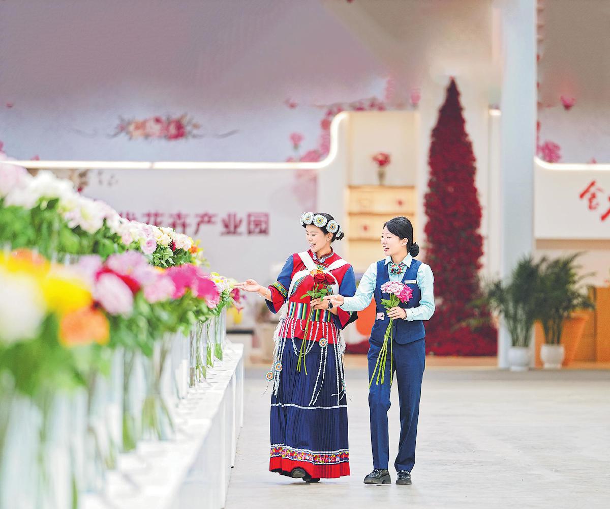 邮政小哥把一箱箱鲜花邮件搬上邮车,让花香随邮车驶向机场,奔向全国消费者。
